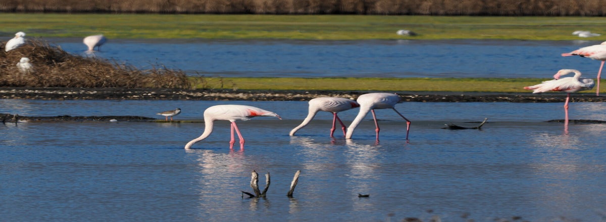 Pelikane und Flamingos an Seen und Lagunen der Adria