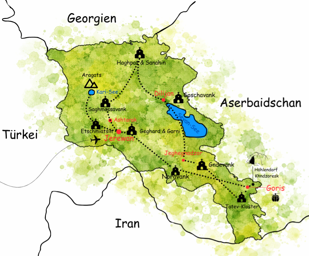 Jenseits der schneebedeckten kaukasischen Riesen liegt Armenien - zerklüftet, steinig und uralt. Das geschichtsträchtige kleine Land hat eine Menge unverbrauchter Natureindrücke und kultureller Höhepunkte zu bieten. Hohe Berge wechseln mit tiefen Schluchten, schäumenden Gebirgsbächen, dichten Wäldern und üppig blühenden Blumenwiesen. Im Jahre 301 n.Chr. wurde hier das Christentum weltweit erstmalig zur Staatsreligion erhoben. Viele Klöster künden als architektonische Perlen vom tiefen Glauben der Bevölkerung. Tauchen Sie ein in die vielfältigen Landschaften Armeniens, erleben Sie jahrtausendalte Baudenkmäler und den einzigen heidnischen Tempel im gesamten Kaukasus. Wandern Sie auf interessanten Pfaden durch malerische Schluchten und bewundern Sie die Gebirgsflora von Goris und Jermuk. Und dann wartet noch ein besonderes Schmankerl für sportlich Ambitionierte: Sie haben die Möglichkeit, den Südgipfel des 4095 m hohen Aragats zu besteigen.
